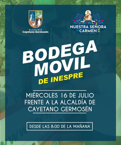 La Alcaldía de Cayetano Germosén trae este miércoles 16 de julio, la Bodega Móvil de INESPRE con productos frescos y a bajos precios para todos. Frente al Ayuntamiento Municipal desde las 8:00 de la mañana. Una excelente oportunidad para ahorrar y comprar con economía. Invita la Alcaldía en el marco de las Fiestas Patronales Nuestra Señora del Carmen 2025.