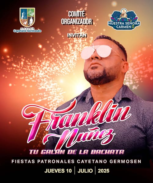 Fiestas Patronales Nuestra Señora del Carmen 2025 la Alcaldía de Cayetano Germosén y el Comité Organizador siguen celebrando en grande este cuarto día de patronales nos acompaña en tarima uno de los nuestros Franklin Núñez, el galán de la bachata, estará deleitándonos con su talento y sabor.