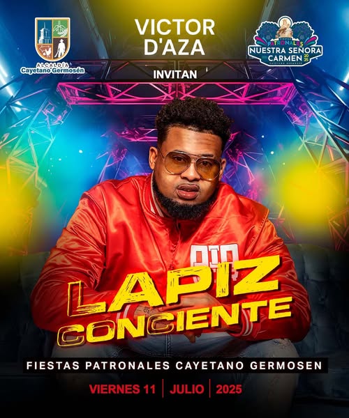 Hoy viernes hay letra y fuego en la tarima llega el papá del Rap el Lápiz Conciente a las Fiestas Patronales de Cayetano Germosén a tarima. Viernes 11 de Julio 2025 por parte de Víctor D’Aza, la Alcaldía de Cayetano Germosén y el Comité Organizador de las fiestas.