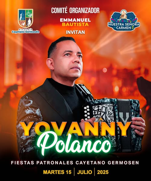 Atención para los amantes del típico este martes 15 de julio, llega el maestro del acordeón, el más fino del típico Yovanny Polanco a las fiestas patronales de Cayetano Germosén promete ser una noche para gozar, cantar y bailar con uno de los grandes del merengue típico. Invitan: Emmanuel Bautista, Comité Organizador y la Alcaldía de Cayetano Germosén.